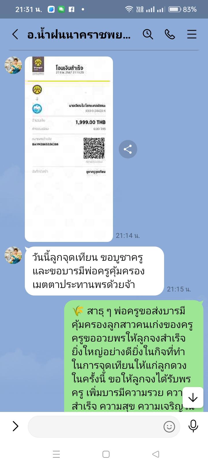 ❤ ศิษย์รัก ที่มีนามว่า... "อาจารย์ ชญาณิศ พิศพาน" (อ.น้ำฝน นาคราชพยากรณ์) ได้โอนปัจจัยมาดูแลครู อีกครั้ง เป็นครั้งที่ 31 ด้วยว่าในทุกครั้งที่ศิษย์รัก "อาจารย์ ชญาณิศ พิศพาน" (อ.น้ำฝน นาคราชพยากรณ์) จะใช้วิชาที่ได้เรียนกับครู อันได้แก่ "วิชาเทียนแขนงต่าง" เพื่อทำการจุดให้กับลูกดวง ก็ได้ทำการโอนปัจจัยมาดูแลครูก่อนเวลาในการจุดเทียนในทุกครั้ง พร้อมทั้งขอพรครูก่อนในทุกครั้ง ถือว่าเป็นศิษย์ที่น่ารัก และฉลาดมาก ในการขอรับพรแรงครู อันส่งผลไปสู่ความสำเร็จที่ยิ่งใหญ่ของศิษย์